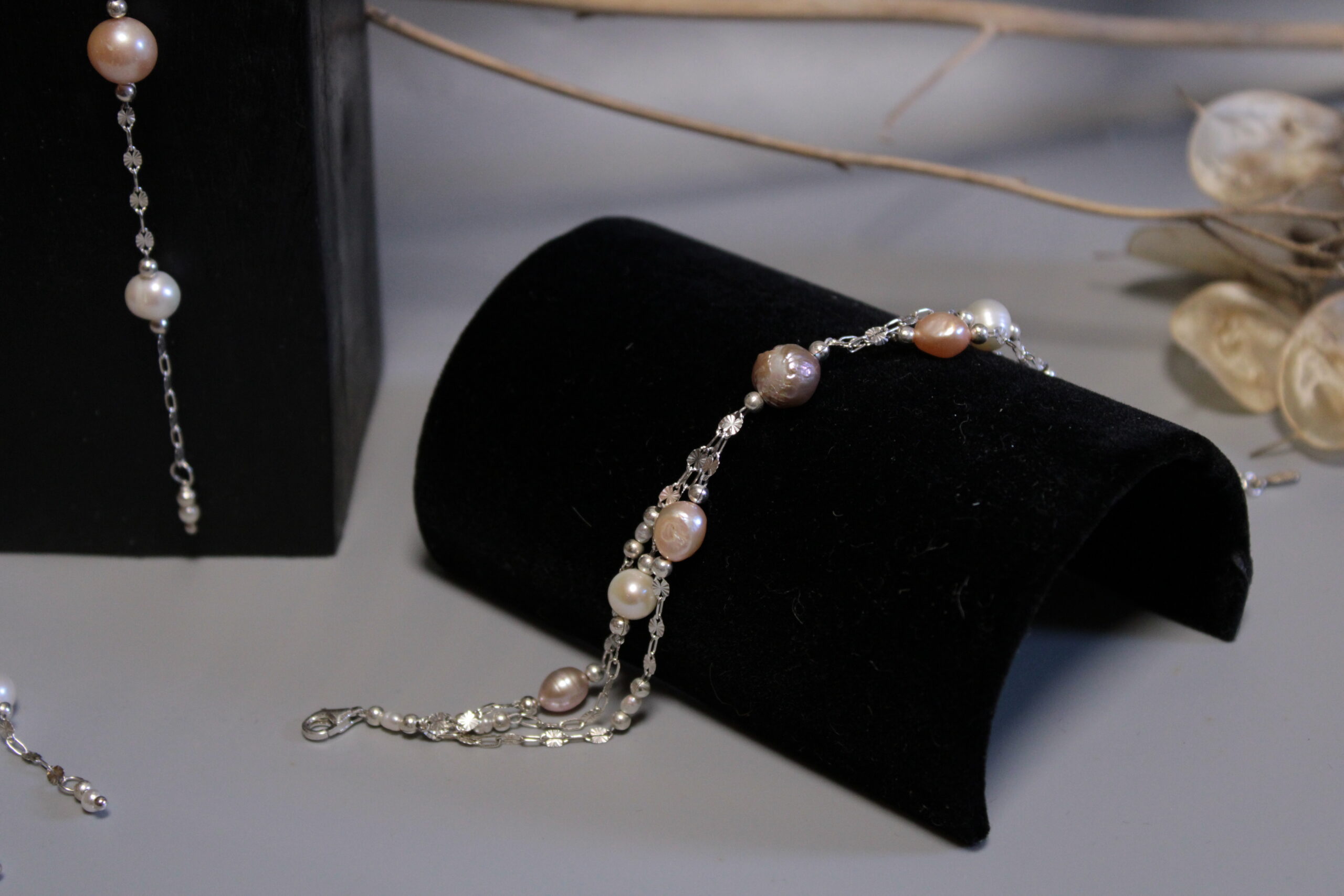 Autour de ce trésor, des perles de culture rondes de tailles variées sont délicatement dispersées sur des chaînes en argent 925, apportant légèreté et fluidité au design.