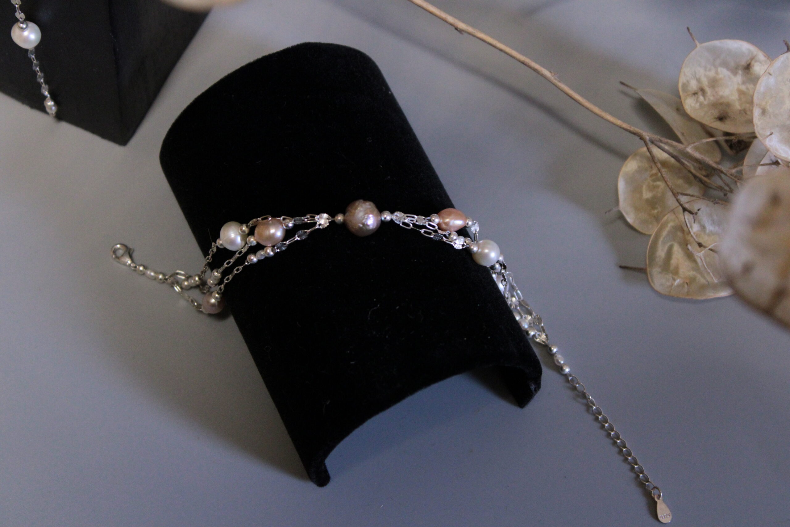 Inspiré de la nymphe marine Thétis, figure mythologique des flots, ce bracelet multirang capture l’essence des eaux nacrées.